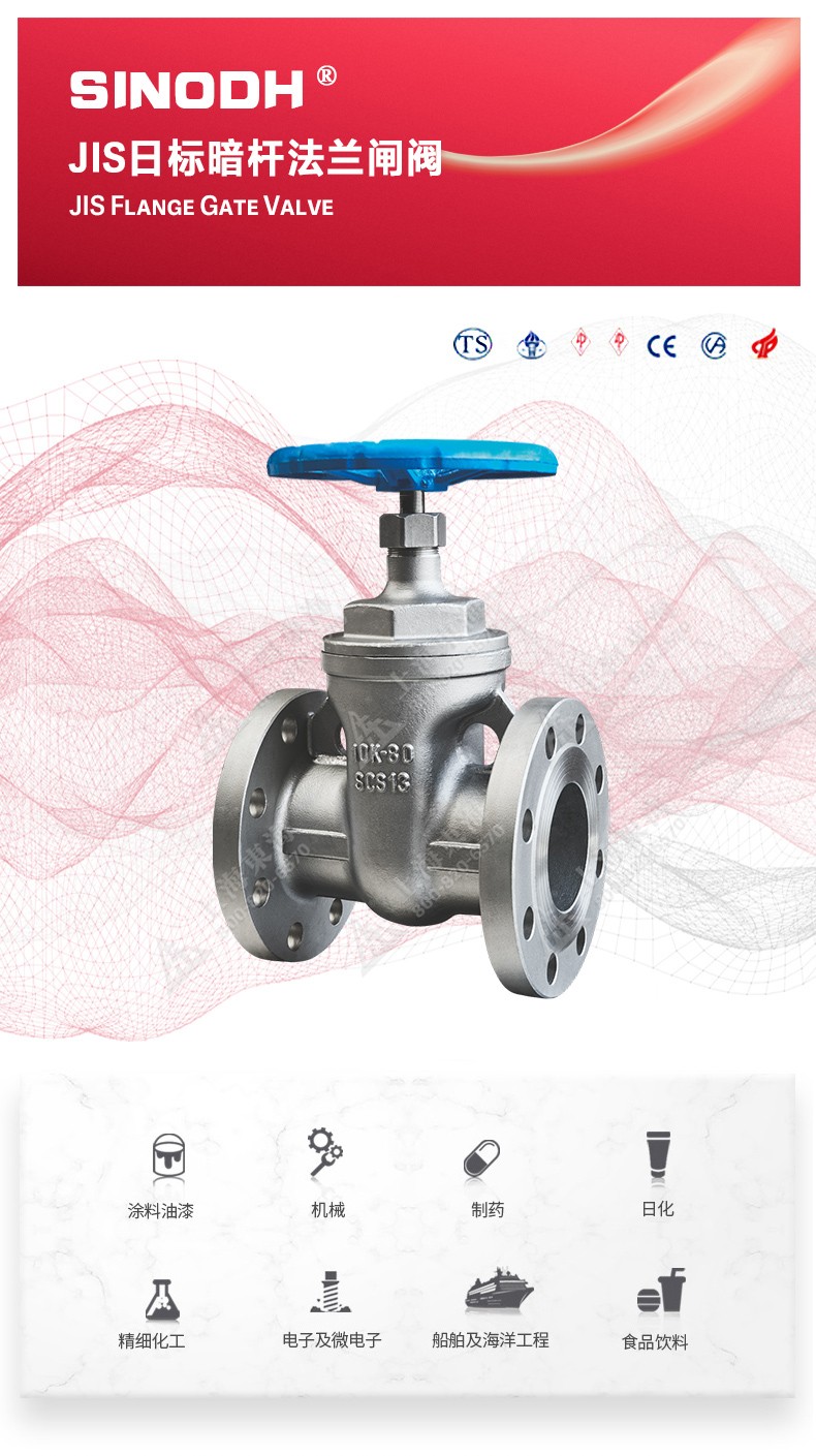 JIS日标暗杆法兰闸阀,为乐动网页版登录入口自主研发生产。本产品设计制造标准符合JISB2071标准,该产品是一种最常见的启闭阀,利用闸板的上下工作来接通(全开)和截断(全关)管道中的流体介质。